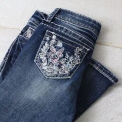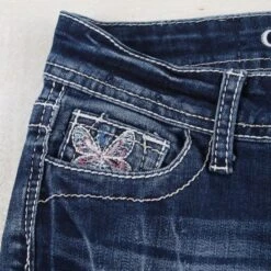 - Sequins, silver stitching, and butterflies and horseshoe detailing on back pockets